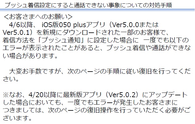 4/6以降、 AppStoreよりiOS版050 plusアプリを新規にダウンロードされた一部のお客様で、着信方法を「プッシュ通知」に設定している場合に 「認証に失敗しました。しばらくしてから操作しなおしてください(401)」と表示される事象が発生しておりましたが、4/20に公開したVer5.0.2で修正いたしました。