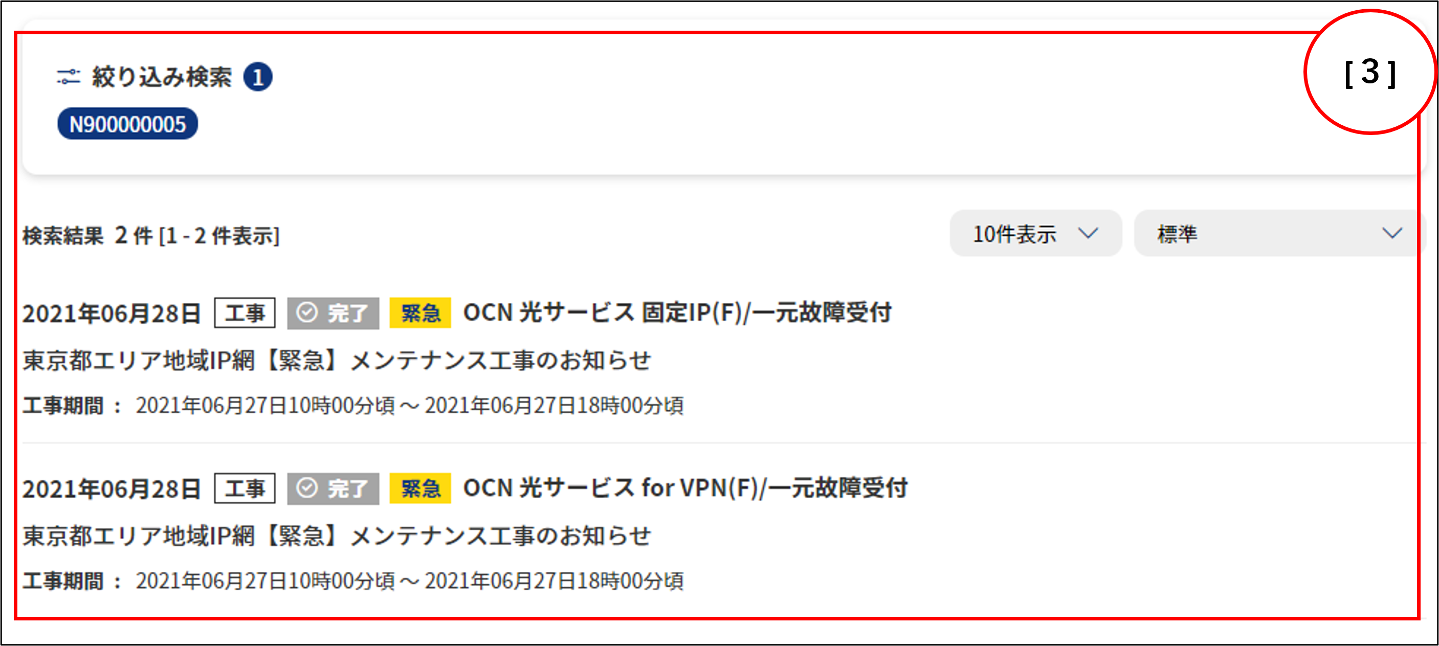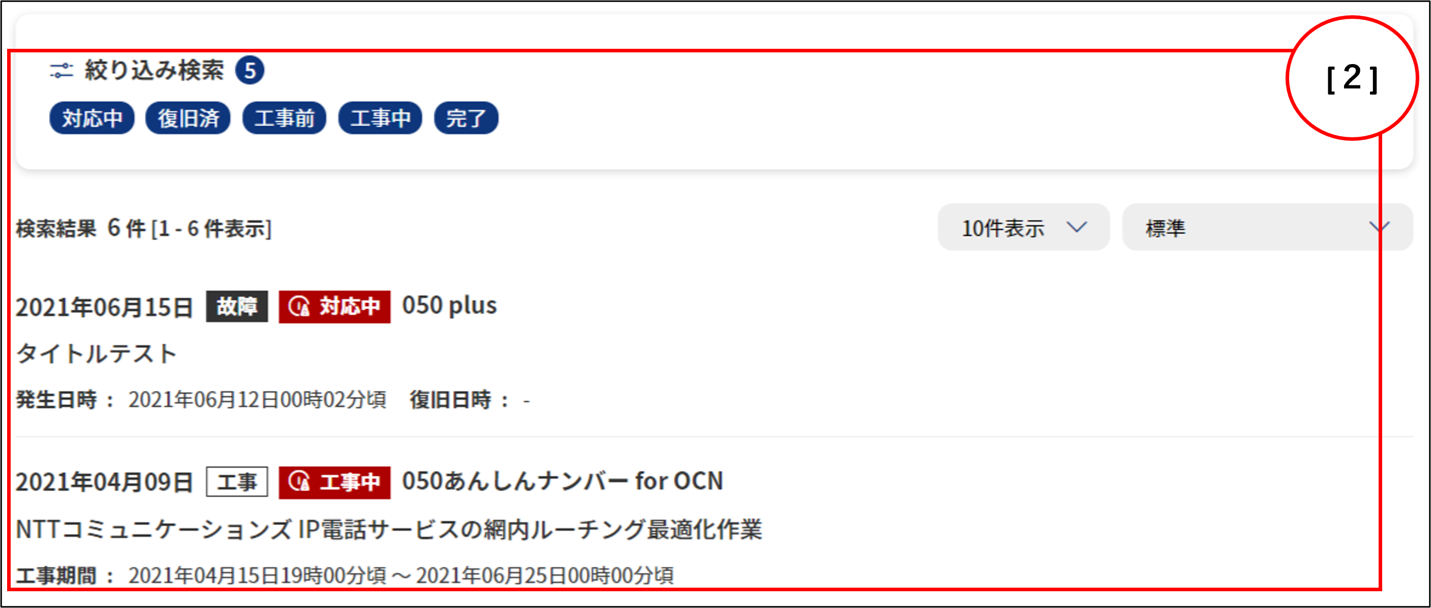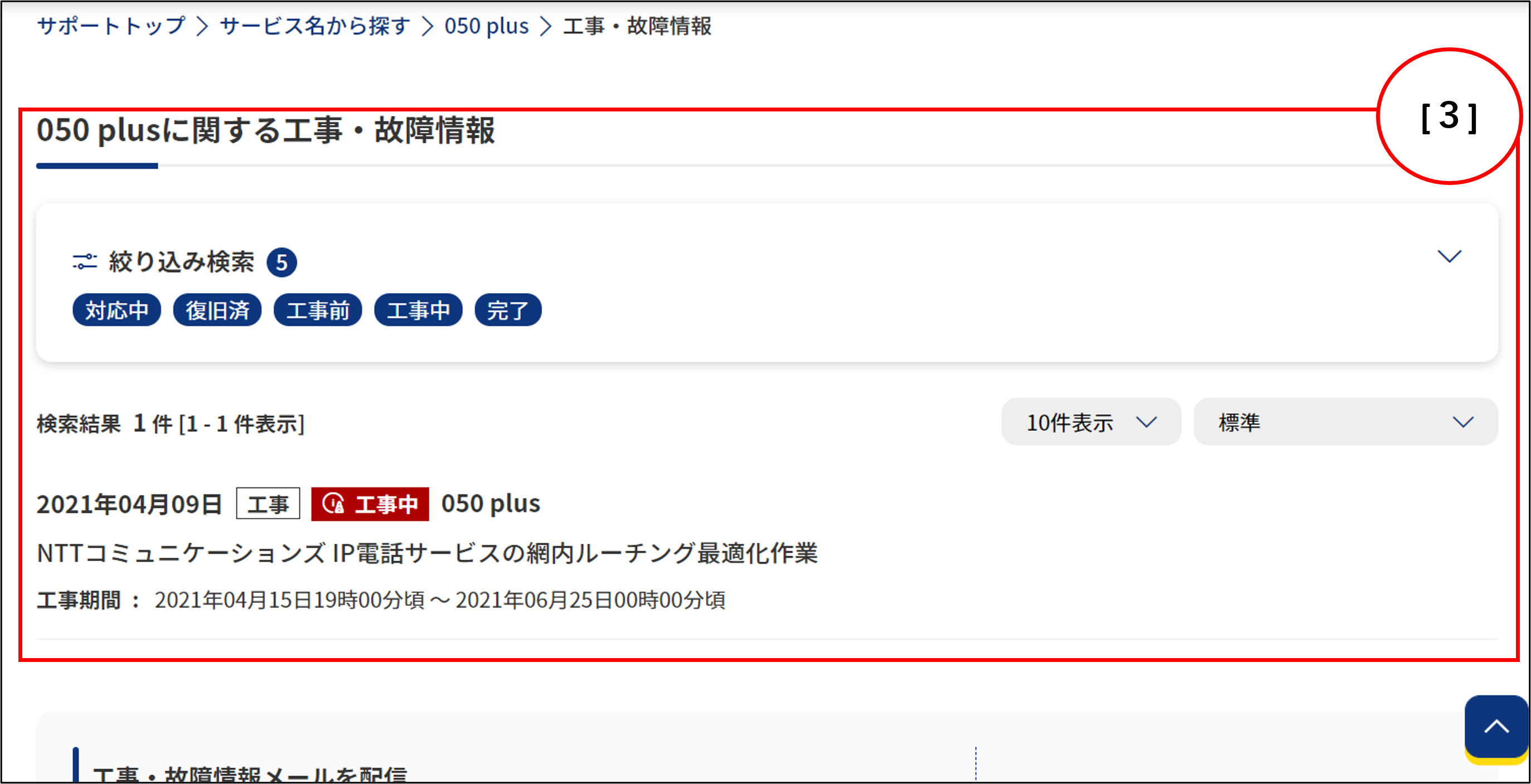 - 選択した条件に合う工事・故障情報一覧が表示されます。