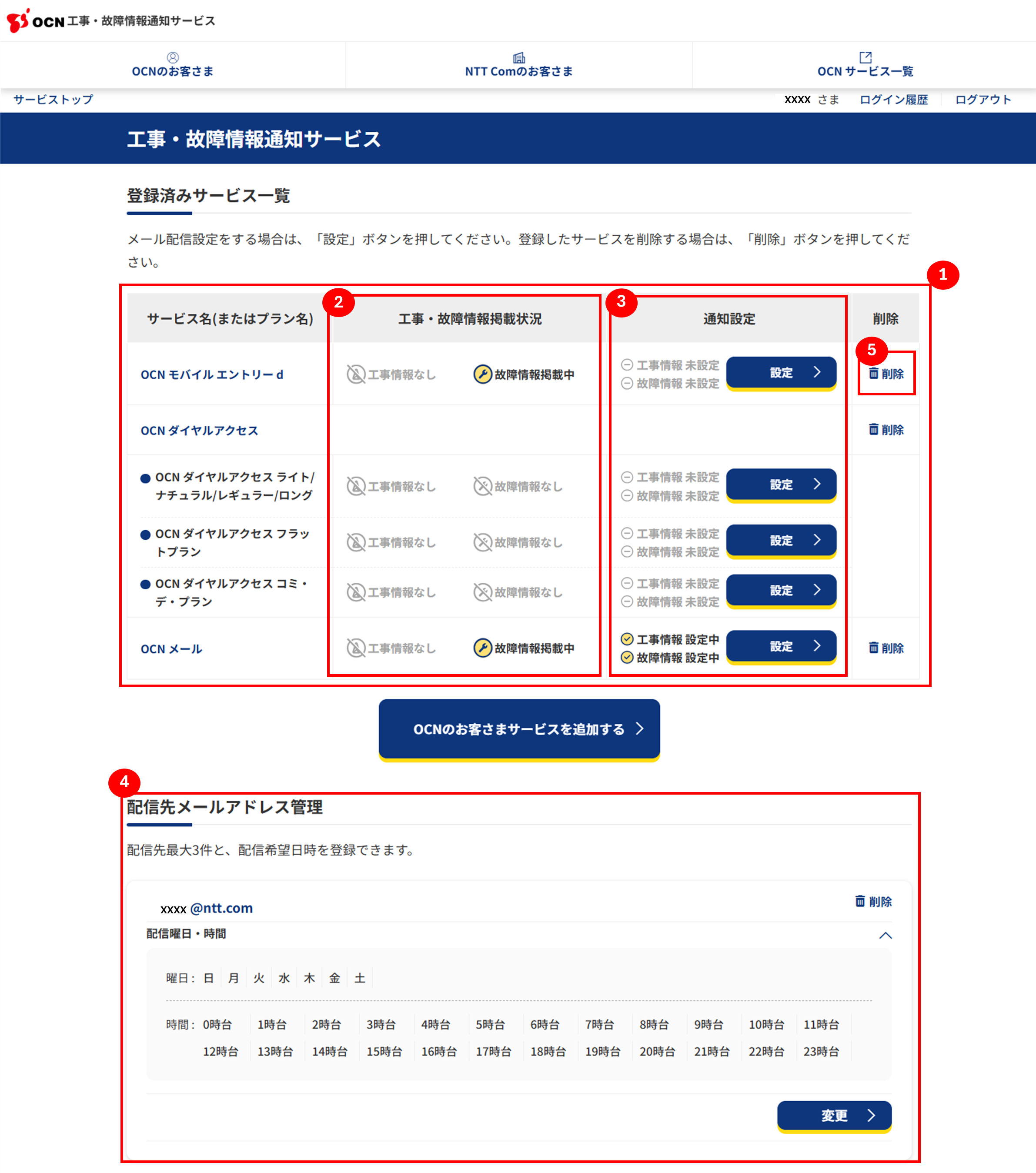 - [1] 工事・故障情報通知サービスに登録したサービスの一覧