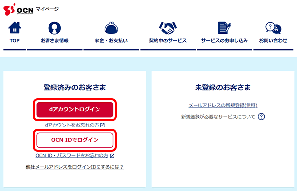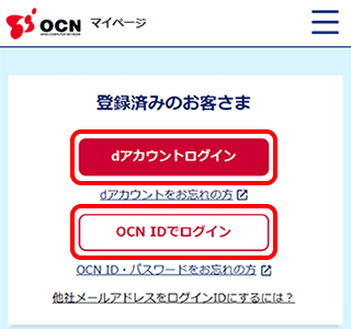 [dアカウントログイン]または[OCN IDでログイン]からログインします。