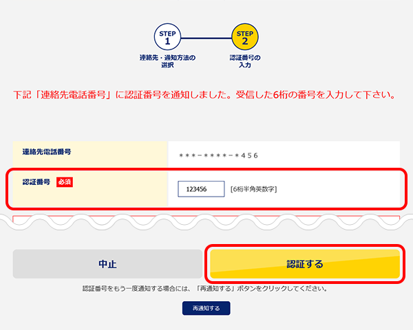 SMSまたは自動音声によりお知らせする6桁の認証番号を確認し、30分以内に次の手順に進みます。