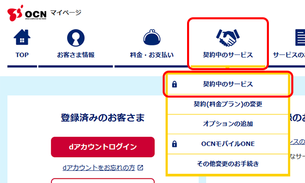 ログイン後、[契約中のサービス]にマウスカーソルを合わせ[契約中のサービス]をクリックします。