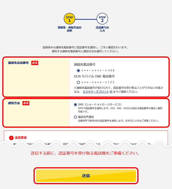 [連絡先電話番号]から認証番号の通知を受ける電話番号を選択します。[通知方法]を選択し[送信]をクリックします。 -