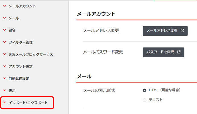2.左メニューから[インポート/エクスポート]をクリックします