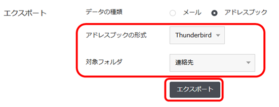 図のように表示されます。[アドレスブックの形式]と[保存先のフォルダ]を選択し、[エクスポート]をクリックします