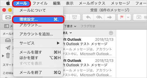 5.メニューバーの[メール]-[環境設定]をクリックします。