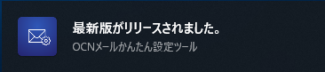 メールかんたん設定ツール(Windows10専用)の 旧バージョンをインストール済みのお客さまにおきましては、パソコン起動時にアップデート通知にてバージョンアップのご案内をさせていただきます。その際、「インストール」を選択し、更新をお願いいたします。