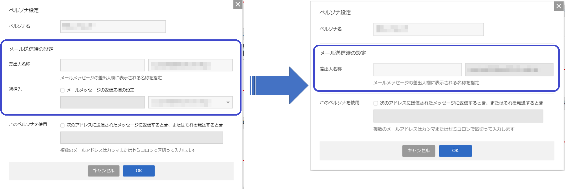 ・第一アカウント、ペルソナの「差出人名称」(ディスプレイネーム)および「返信先」でご自身のメールアドレス以外を設定されている方