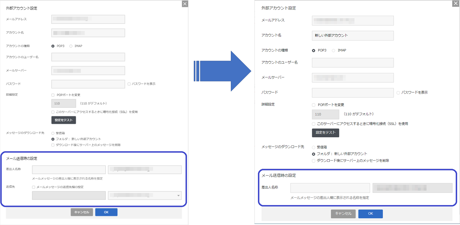 ・外部アカウント設定にての「差出人名称」(ディスプレイネーム)および「返信先」でご自身のメールアドレス以外を設定されている方