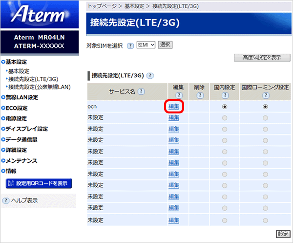 [基本設定]-[接続先設定(LTE/3G)]をクリックします。 -