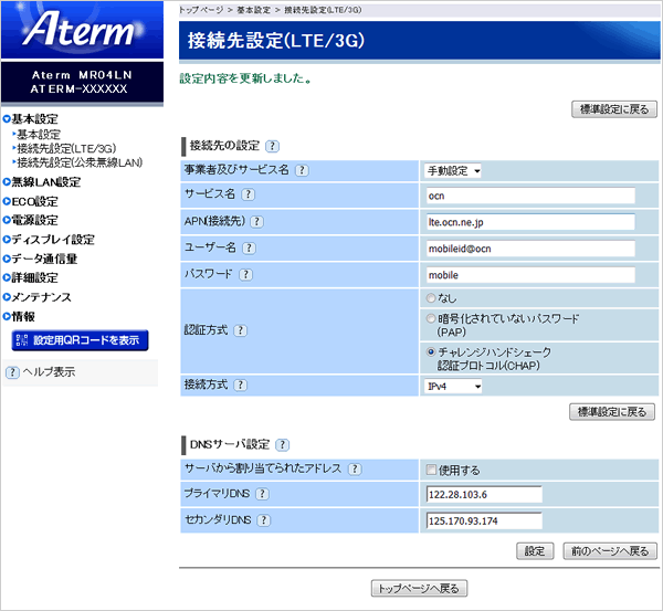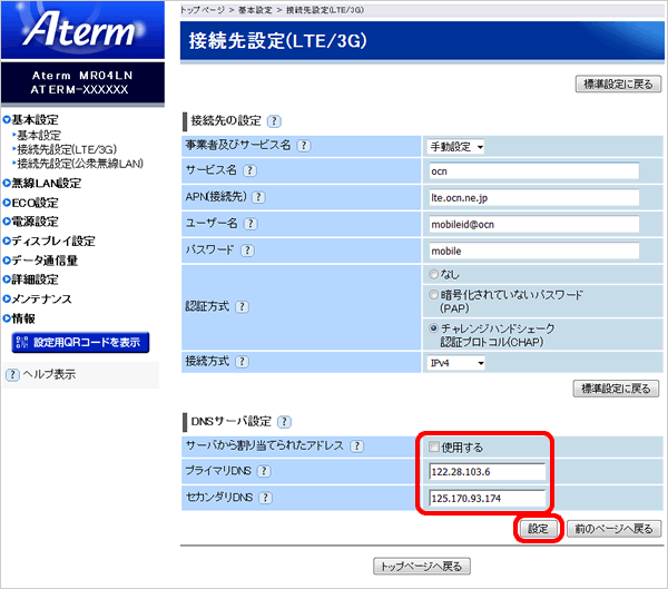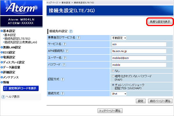 本手順ではMR04LNを使用しています。他の機種をお使いの場合はルーターの取扱説明書を参照して以下の設定値を変更後、手順 9へお進みください。