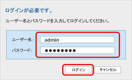 上段に admin、下段に設定した管理者パスワードを入力し、[OK]または[ログイン]をクリックします。 -