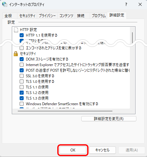 - [セキュリティ]欄の[TLS 1.2の使用]にチェックします。
