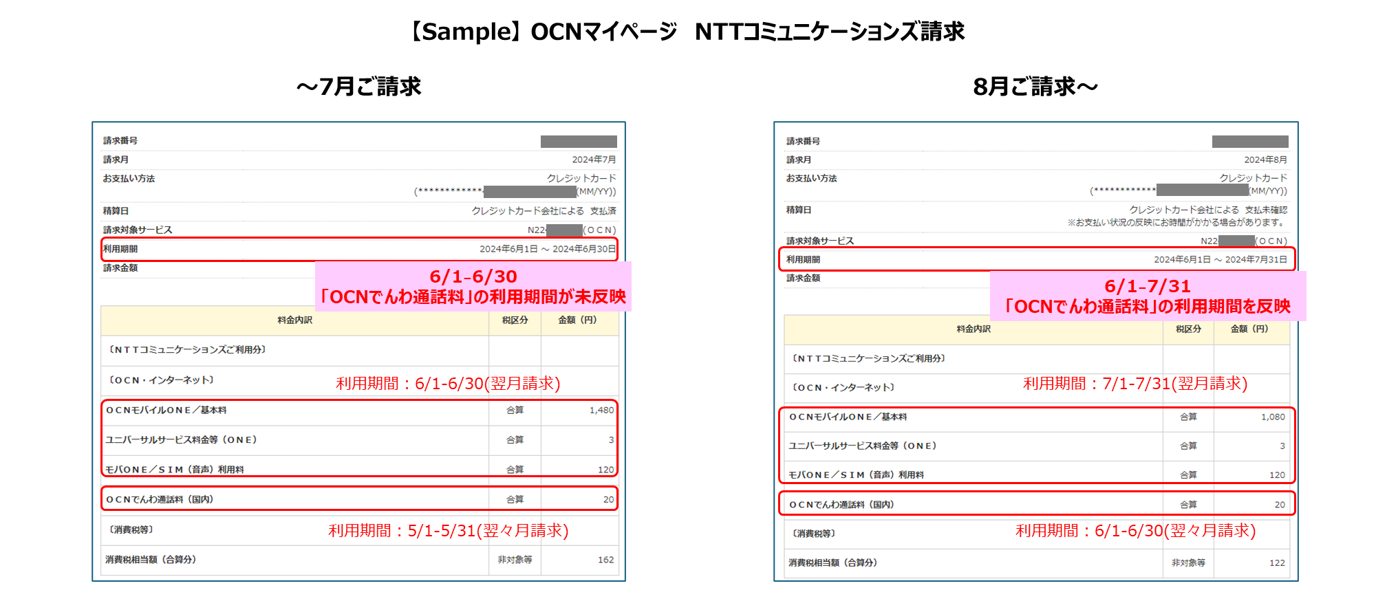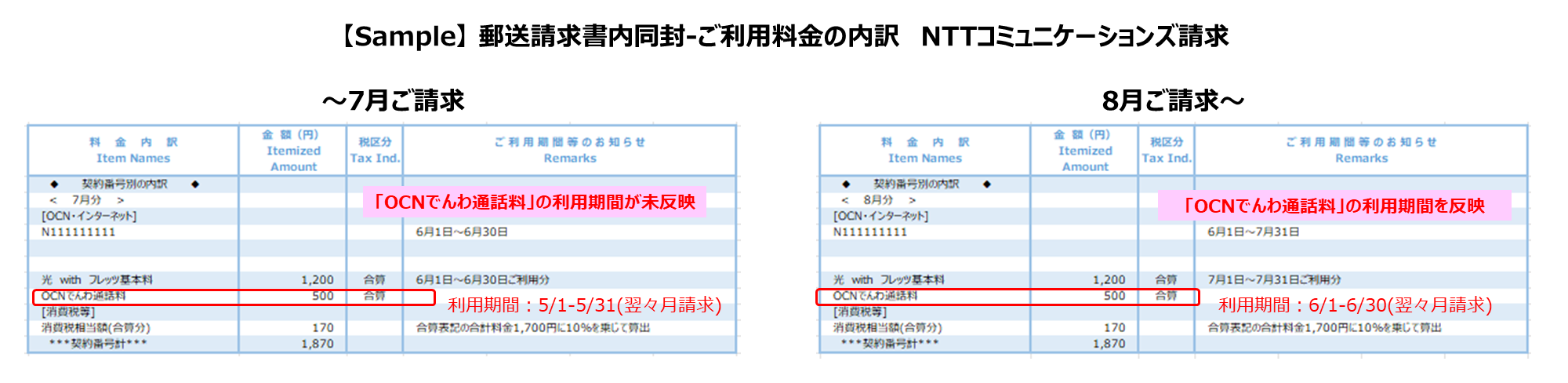 これまでは、翌月請求の基本料金(インターネット接続サービス、OCN モバイル ONE等)に基づき、利用期間を表記しておりましたが、8月ご請求分から翌々月請求となるオプション料金(OCNでんわ通話料/SMS通信料などの従量サービス)も含めた利用期間に変更いたしました。